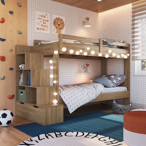 Características Estrutura em MDP Acabamento Fosco Estrado Lastros em MDF cru Escadas Laterais Podem ser Montadas lado Direito/Esquerdo Protetores Laterais na Cama Superior Sapatas Plásticas 05 Nichos 02 Gavetas com Corrediças Telescópicas Metálicas Puxadores embutidos Beliche Suporta até 60 kg sem Impacto cada Andar IDEAL PARA COLCHÃO 188 X 78cm NÃO ACOMPANHA COLCHÃO