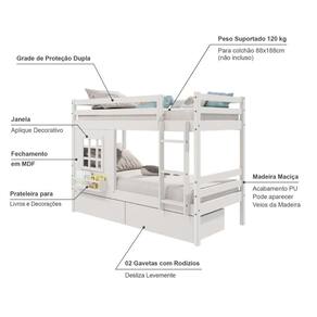Material Principal: Madeira Maciça | Cor: Branco | Necessita Montagem: Sim | Acompanha Colchão: Não | Tipo de Cama: Beliche