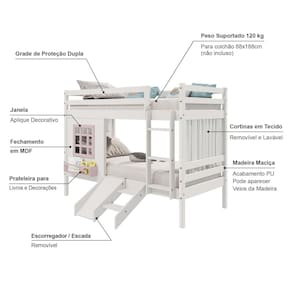 Diferenciais: Escada Fixa, Grade de Proteção Dupla, Janela com fechamento em MDF e Prateleira para Livros e Decoração, Kit Escada/ Escorregador, Cortina.