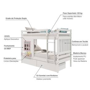 Diferenciais: Escada Fixa, Grade de Proteção Dupla, Janela com fechamento em MDF e Prateleira para Livros e Decoração, 02 Gavetas, Cortina.
