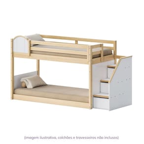 Transforme o quarto com o Beliche New Garden, um espaço de descobertas e segurança. Com estrutura em madeira maciça, garante durabilidade e se destaca pela praticidade e funcionalidade. Os degraus com espaço de armazenamento otimizam o ambiente e facilitam a organização. Para um toque de magia, o LED no corrimão da escada cria uma iluminação suave e convidativa. As camas são para colchões de solteiro (188x88cm), com altura máxima de 15cm para o colchão superior, e cada cama suporta até 100kg. O beliche se adapta às suas necessidades, a janelinha superior pode ser montada para o lado direito ou esquerdo, ainda podemos retirar a janelinha e montar em seu lugar o escorregador (VENDIDO SEPARADAMENTE). Acompanha Cama Auxiliar: Não Acompanha Colchão: Não Acompanha Grade de Proteção: Sim Altura do Estrado até o Chão: 6 cm Ambiente Principal: Quarto Infantil codigo_ean: 7900288209795 Complexidade da Montagem: Média: pode ser montado por mais de uma pessoa e/ou necessite de maior conhecimento para montagem Cor: Natural/Branco Cor do Produto: Natural/Branco Escala de Brilho: Semi-Fosco Informações Complementares: Altura máx. indicada para o colchão da cama superior é de 15cm. Grades acompanham somente na parte superior do produto. Itens Inclusos: 1 Beliche, kit ferragens e manual de montagem Linha ou Coleção: New Garden Manual de Montagem e Instalação: https://product-hub-prd.madeiramadeira.com.br/963558972/documents/a68bc91a-a3f0-4f74-a001-c90ca0dbab7e3125460338717546650252854.pdf Marca: Casatema Material da Cabeceira: MDF Material do Estrado: Madeira Maciça Material Principal: Madeira Maciça modular: Não Necessita Montagem: Sim Origem do Produto: Nacional Permite a Utilização de Cama Auxiliar: Não Peso: 85 kg Possui Baú: Não Possui Gavetas: Não Possui Pés: Não Possui Portas: Não Possui Prateleiras: Não Recomendações de Uso, Manutenção e Limpeza: Na limpeza não utilizar produtos químicos e abrasivos, usar apenas com pano umedecido, para garantir a maior durabilidade do móvel. Sistema de Montagem: Parafusos Suporta Até (kg): 200 kg Tamanho da Cama: Solteiro Tamanho do Colchão Indicado (L x C): 88cm x 188cm Tipo de Cama: Beliche Tipo de Colchão: Solteiro Tipo de Estrado: Fixo Tipo de Grade de Proteção: Grade Tipo de Madeira Maciça: Pinus