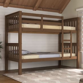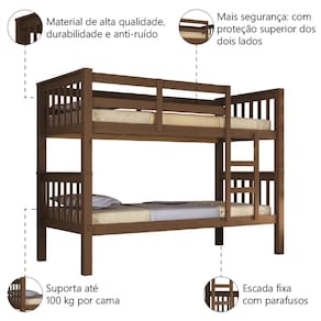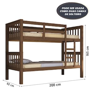 MEDIDAS: [ A ] = 165 cm [ L ] = 92 cm [ P ] = 200 cm PESO SUPORTADO POR CAMA: 100 Kg Características MARCA: PederPinus MODELO:Beliche Madeira Maciça Esmeralda COR: Imbuia MATERIAL: Pinus ACABAMENTO: Acetinado TAMANHO: Para colchões de solteiro 0,88m SISTEMA DE MONTAGEM: Parafusos GARANTIA: 3 Meses DIFERENCIAL: Escada pode ser montada de ambos os lados, camas separadas.