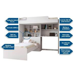 Dimensões(Cm): Comnto(Profundidade): 92,5cm x Largura: 197,5cm x Altura: 176,5cm Material de Estrutura - MDF/MDP Tipo de Pintura - Ultravioleta Tipo de Acabamento da Pintura - Semi Brilho Diferenciais dos Móveis de Quarto - Móvel c/ Baú Tamanho da Cama - Solteiro Diferenciais das Camas - Escada Lateral - Proteção Lateral - Escada Metálica Quantidade de Gavetas - 1 Gaveta Quantidade de Prateleiras - 1 Prateleira - 5 Montagem do Produto - Desmontável Certificação de Qualidade - Qualidade Aprovada - ISO 9001 - ISO 14001 Garantia - 3 meses