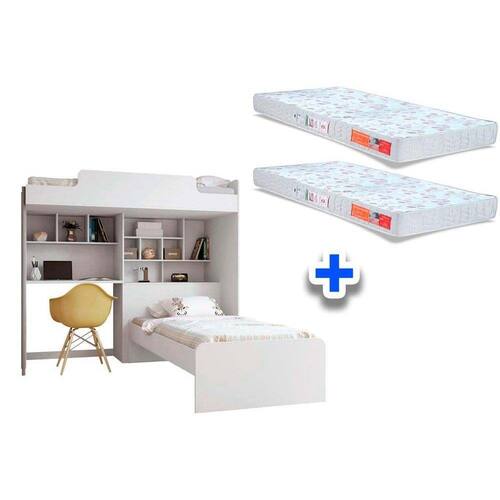 Beliche Office New Santos Andirá (Módulo Office+Cama Juvenil) + 2 Colchões - C o r Branco/Branco