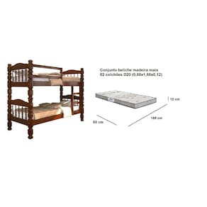 Beliche Palmo – CASTANHO ?Beliches são ótimos aliados para quem quer poupar espaço. A Beliche Palmo é uma ótima pedida para compor o seu dormitório. Além de ser um móvel funcional também reúne design e estilo, combina com diversos tipos de decorações. Confeccionado com madeira pinus, sua estrutura possui mais resistência e oferece mais segurança para as suas noites de sono. Características Gerais - Para Colchão 0.88 x 1.88 - Produto fabricado em 100% Madeira Maciça Pinus. - Espessuras dos pês 0.8 x 0.8 cm - Grade Lateral maciça reforçada; - Possui Estrado Reforçado; - Exclusiva Grade de Proteção na parte lateral - Suporta no Máximo 150kg; - Possui um Fino Acabamento;. - Ripas e sarrafos do estrado em madeira maciça. - Produto versátil encaixa em vários ambientes. - Lindo design. - Dimensão aproximada: Largura: 96 cm Comprimento: 2,04 m Altura: 154 cm Peso: 32kg Sobre os colchões Leve e prático, o colchão Gazin dream vai te acompanhar para qualquer lugar, seja na praia, camping ou na sala de casa para ver filmes ou maratona sua série favorita. Além dessa praticidade e leveza, ele é extra macio e confortável com sua espuma D20, liso e com tecido stretch fácil de limpar. É o melhor custo-benefício que você vai encontrar em toda a internet! Características do produto Tamanho: Solteiro 88 Tipo de enchimento: Espuma Com pillow: Não Peso máximo suportado: 60 kg cada Marca Prorelax Composição Tipo de enchimento: Espuma Composição do tecido: Strech Dimensões Largura x Comprimento x Altura 88 cm x 188 cm x 12 cm Especificações É infantil: Não Peso máximo suportado 60 kg Firmeza: Média Não Stretch: A elasticidade e a suavidade são os principais pontos altos do revestimento. Ele é fabricado com um fio elástico sintético, que é tecido em conjunto a outros fios (de fibras naturais ou sintéticas). Cuidados: Usar em local seco com passagem de ar. Evite contato com o sol. Não dobrar ou deixar em pé. Gire o colchão quinzenalmente, e vire as faces a cada mês (em colchões double face). Atenção! Confira as dimensões deste produto e certifique-se de que passará normalmente por supostos elevadores, portas, escadas e/ou corredores de sua moradia; As imagens são ilustrativas, eletrodomésticos e demais objetos que compõem o cenário, não fazem parte do anúncio; Sobre a tonalidade das cores, poderá ocorrer alterações conforme a configuração do seu monitor. Orientamos que a montagem e instalações do produto seja realizado por um técnico de sua confiança, após a sua entrega. Não nos responsabilizamos pela instalação/montagem. Fornecemos somente assistências, por defeitos de fábrica.