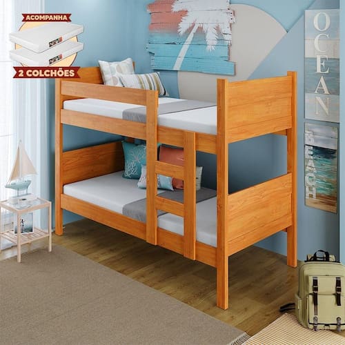 AS IMAGENS SÃO MERAMENTE ILUSTRATIVAS E PODEM SOFRER VARIAÇÕES DE COR E PEQUENOS DETALHES DE ACORDO COM O SEU MONITOR, ILUMINAÇÃO DO AMBIENTE E ATÉ MESMO A SUA PERCEPÇÃO VISUAL.Beliche Resistente Fortaleza em Mdf Vira 2 Camas Solteiro Nature Amadeirado com 2 ColchÃes
