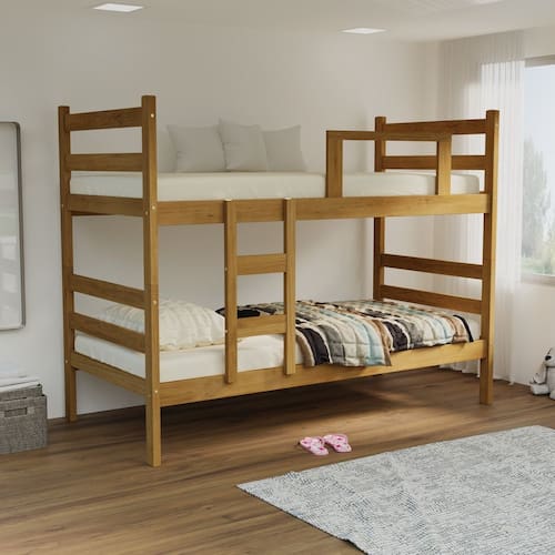 Produto desenvolvido para quartos com pouco espaço, casas e apartamentos, sem perder o estilo. Esta Beliche é produzida em 100% madeira maciça de eucalipto e conta com acabamento em Cera Mel, além de ser super resistente e alta durabilidade. Ecologicamente correta, toda madeira utilizada na fabricação desse produto é de reflorestamento. Acompanha Cama Auxiliar: Não Acompanha Colchão: Não Altura do Estrado até o Chão: 37 cm Ambiente Principal: Quarto Complexidade da Montagem: Média: pode ser montado por mais de uma pessoa e/ou necessite de maior conhecimento para montagem Comprimento: 197,5 cm Cor: Cera Mel Cor do Produto: Cera Mel Escala de Brilho: Fosco Extensível: Não Itens Inclusos: Beliche e manual de montagem Linha ou Coleção: Rústico Manual de Montagem e Instalação: https://product-hub-prd.madeiramadeira.com.br/909594/documents/f52fd754-3942-4783-bde2-6b123fa8f50a1973062528417163148681169.pdf Material da Escada: Madeira Maciça Material do Estrado: Madeira Maciça Material Principal: Madeira Maciça Necessita Montagem: Sim Origem do Produto: Nacional Permite a Utilização de Cama Auxiliar: Sim Peso: 47,2 kg Peso Suportado por cada cama: 80 kg Possui Baú: Não Possui Escrivaninha: Não Possui Gavetas: Não Possui Nichos: Não Possui Pés: Não Possui Portas: Não Possui Prateleiras: Não Possui Rodízio: Não Recomendações de Uso, Manutenção e Limpeza: Limpar com pano seco e limpo. Sistema de Montagem: Parafusos, Cavilhas Tamanho da Cama: Solteiro Tamanho do Colchão Indicado (L x C): 88cm x 188cm Tipo de Cama: Beliche Tipo de Colchão: Solteiro Tipo de Estrado: Fixo Tipo de Madeira Maciça: Eucalipto