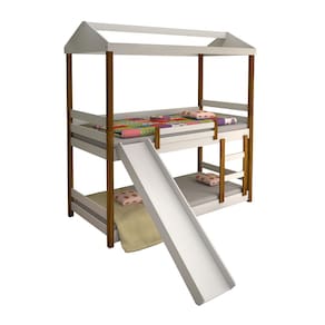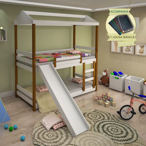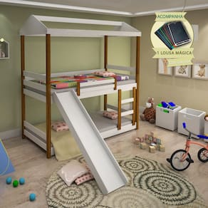 A estrutura em branco com detalhes em néctar das flores traz um toque aconchegante e elegante à decoração, enquanto o escorregador garante momentos de pura alegria no dia a dia. Ideal para otimizar espaços, o beliche é perfeito para irmãos que compartilham o quarto ou para quem deseja receber visitas com conforto.