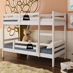 Detalhes do produto: Modelo: BL140 Material: Madeira Maciça de Pinus de Reflorestamento e MDF grosso de 2,2cm de espessura Pintura/Acabamento: Pu Branco /Castanho e UV 30% brilho (deixando aparente os veios da madeira) Para Colchões de Dimensões (cm x cm): 188x88 Colchão: Não incluso Peso Suportado : 120 Kg por cama Acessórios: Escada Fixa Altura entre camas: 81cm