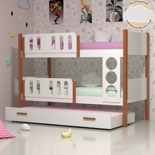 Beliche Solteiro Ônix com Cama Auxiliar Branco com Caramelo Acompanha Luminária Nuvem