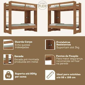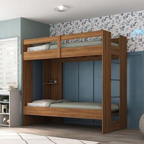 Beliche Solteiro Savana 1 Prateleira Nogal Espresso Móveis. Beliche solteiro com prateleira integrada em nogal. Design moderno e funcional. Ideal para economizar espaço. Fabricado pela Espresso Móveis. Durável e resistente. Opção versátil para quartos compartilhados. Entrega rápida e garantia de qualidade. Acabamento da Prateleira: Finish Foil Acompanha Cama Auxiliar: Não Acompanha Colchão: Não Altura do Estrado até o Chão: 42 cm Altura do Estrado Superior até o Chão: 137 cm Ambiente Principal: Quarto Complexidade da Montagem: Média: pode ser montado por mais de uma pessoa e/ou necessite de maior conhecimento para montagem Cor: Nogal Cor do Produto: Nogal Escala de Brilho: Fosco Escala de Brilho da Prateleira: Fosco Extensível: Não Itens Inclusos: Produto + Kit Ferragem + Manual de Montagem Manual de Montagem e Instalação: https://product-hub-prd.madeiramadeira.com.br/892117/documents/80388716-b1f4-4f57-8d98-98ed3bb5a4399842manualdemontagemcm1230.pdf Material da Escada: Metálica Material da Prateleira: MDP Material do Estrado: MDF Material Principal: MDP Montagem Flex: Sim Necessita Montagem: Sim Origem do Produto: Nacional Permite a Utilização de Cama Auxiliar: Sim Peso: 85 kg Peso Máximo por Prateleira: 3 kg Peso Suportado por cada cama: 80 kg Possui Baú: Não Possui Escrivaninha: Não Possui Gavetas: Não Possui Nichos: Não Possui Pés: Não Possui Portas: Não Possui Prateleiras: Sim Possui Rodízio: Não Quantidade de Prateleiras: 01 Prateleira Recomendações de Uso, Manutenção e Limpeza: Para Limpeza Utilizar Pano Seco Sistema de Montagem: Minifix, Parafusos e Cavilhas Tamanho da Cama: Solteiro Tamanho do Colchão Indicado (L x C): 88x188 Tipo de Cama: Beliche Tipo de Colchão: Solteiro Tipo de Estrado: Fixo