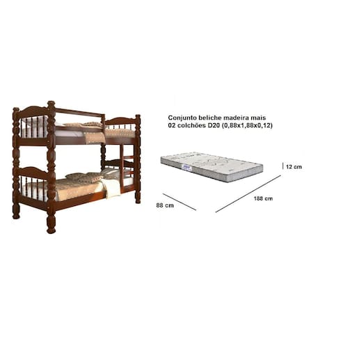 Beliche Palmo – CASTANHO ?Beliches são ótimos aliados para quem quer poupar espaço. A Beliche Palmo é uma ótima pedida para compor o seu dormitório. Além de ser um móvel funcional também reúne design e estilo, combina com diversos tipos de decorações. Confeccionado com madeira pinus, sua estrutura possui mais resistência e oferece mais segurança para as suas noites de sono. Características Gerais - Para Colchão 0.88 x 1.88 - Produto fabricado em 100% Madeira Maciça Pinus. - Espessuras dos pês 0.8 x 0.8 cm - Grade Lateral maciça reforçada; - Possui Estrado Reforçado; - Exclusiva Grade de Proteção na parte lateral - Suporta no Máximo 150kg; - Possui um Fino Acabamento;. - Ripas e sarrafos do estrado em madeira maciça. - Produto versátil encaixa em vários ambientes. - Lindo design. - Dimensão aproximada: Largura: 96 cm Comprimento: 2,04 m Altura: 154 cm Peso: 32kg Sobre os colchões Leve e prático, o colchão Gazin dream vai te acompanhar para qualquer lugar, seja na praia, camping ou na sala de casa para ver filmes ou maratona sua série favorita. Além dessa praticidade e leveza, ele é extra macio e confortável com sua espuma D20, liso e com tecido stretch fácil de limpar. É o melhor custo-benefício que você vai encontrar em toda a internet! Características do produto Tamanho: Solteiro 88 Tipo de enchimento: Espuma Com pillow: Não Peso máximo suportado: 60 kg cada Marca Prorelax Composição Tipo de enchimento: Espuma Composição do tecido: Strech Dimensões Largura x Comprimento x Altura 88 cm x 188 cm x 12 cm Especificações É infantil: Não Peso máximo suportado 60 kg Firmeza: Média Não Stretch: A elasticidade e a suavidade são os principais pontos altos do revestimento. Ele é fabricado com um fio elástico sintético, que é tecido em conjunto a outros fios (de fibras naturais ou sintéticas). Cuidados: Usar em local seco com passagem de ar. Evite contato com o sol. Não dobrar ou deixar em pé. Gire o colchão quinzenalmente, e vire as faces a cada mês (em colchões double face). Atenção! Confira as dimensões deste produto e certifique-se de que passará normalmente por supostos elevadores, portas, escadas e/ou corredores de sua moradia; As imagens são ilustrativas, eletrodomésticos e demais objetos que compõem o cenário, não fazem parte do anúncio; Sobre a tonalidade das cores, poderá ocorrer alterações conforme a configuração do seu monitor. Orientamos que a montagem e instalações do produto seja realizado por um técnico de sua confiança, após a sua entrega. Não nos responsabilizamos pela instalação/montagem. Fornecemos somente assistências, por defeitos de fábrica.