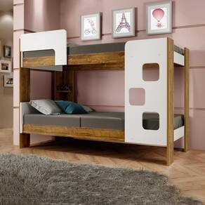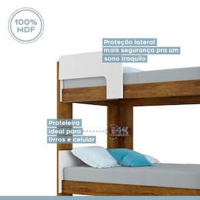 Beliche equipada com cantoneira para celular e proteção lateral na cama superior. Sua escada é projetada na frente para facilitar o acesso à cama superior quando montada em ambiente apertada. Pés e barras em MDF de 25mm dando total resistência e segurança durante o uso. Pode ser utilizada como Treliche adquirindo a Cama auxiliar Tigus baby (vendida separadamente). Acabamento acetinado.