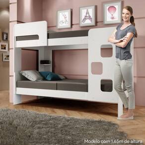 Beliche equipada com cantoneira para celular e proteção lateral na cama superior. Sua escada é projetada na frente para facilitar o acesso à cama superior quando montada em ambiente apertada. Pés e barras em MDF de 25mm dando total resistência e segurança durante o uso. Pode ser utilizada como Treliche adquirindo a Cama auxiliar Tigus baby (vendida separadamente). Acabamento acetinado.