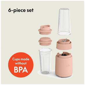 Componentes Inclusos: 6 peças: 1x lâmina de mistura, 2x copos de 400 ml, 1x tampa para viagem, 1x tampa para armazenamento,