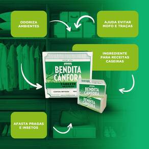 Bendita cânfora tablete estojo 28g display com 16 O produto bendita cânfora estojo é bem versátil e pode ser utilizado para várias finalidades no dia a dia. Em seu formato serve para odorizar ambientes, evitar mofo e afastar pragas e insetos. Também pode servir como ingrediente para diversas receitas caseiras. Marca: Não Informado