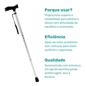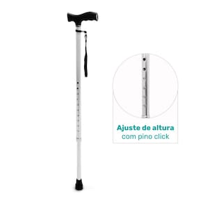 O apoio de mão é anatômico e a bengala dispõe de sistema antirruído (marcha silenciosa), sendo regulável em até 10 níveis de altura através de engate rápido por pino click.