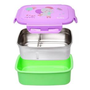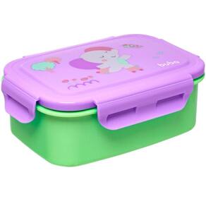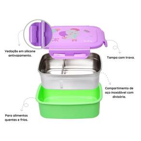 Características Técnicas: Idade recomendada: 1 a 4 anos Capacidade: 600 ml Cor predominante: verde e roxo Composição do produto: Pote: 100% PP Vedação: 100% Silicone Interior: Aço Inoxidável 304 Com divisória ajustável e removível Tampa com vedação em silicone antivazamento Para alimentos quentes e frios Compartimento interno de aço inoxidável Atóxico, higiênico e livre de BPA