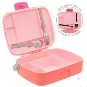 Conta com divisórias internas que mantêm os alimentos no lugar e ainda acompanha talheres em aço inox , tudo para facilitar o dia a dia com muito mais estilo e funcionalidade.