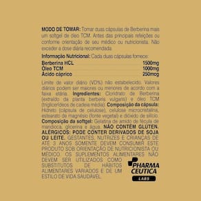 Informações técnicas: Ingredientes: berberina hcl 1500mg , óleo tcm 1000mg e ácido cáprico 250mcg . Composição da cápsula: hidreto cápsula de celulose , celulose microcristalina, estearato de magnésio fonte vegetal e dióxido de silício.