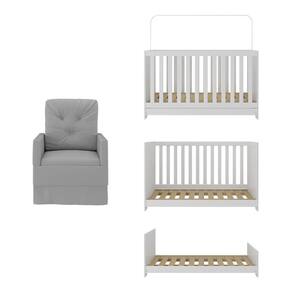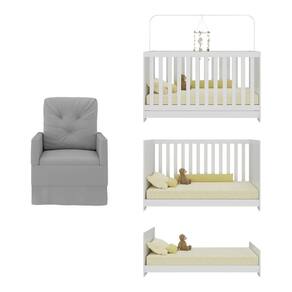 O Berço 3 em 1 com Colchão e Poltrona Amamentação Multimóveis MP4159 é perfeito para proporcionar conforto ao seu pequeno. O berço é produzido em MDP com acabamento acetinado (cerca de 20% de brilho), garantindo durabilidade e resistência. Ele se transforma em sofá e minicama, acompanhando o crescimento do seu filho, possui 3 regulagens de altura para o colchão e acompanha suporte para mosquiteiro, garantindo noites mais tranquilas de sono para o bebê. A grade Soft (PVC) é produzida de maneira ecologicamente correta, com matéria-prima livre de metais pesados, atóxica e com proteção anti-amarelamento. Berço certificado pelo INMETRO sob o selo n 0000085/2018. O colchão possui estrutura em espuma e tecido poliéster e um dos lados é impermeável. De conforto macio, possui tratamento anti-ácaro e anti-alérgico e é indicado para até 50kg. A poltrona de amamentação (suporta até 110kg) é produzida em madeira de eucalipto e espuma densidade D23 com molas reforçadas e mecanismo de balanço. As poltronas nas cores cinza e bege possuem acabamento em tecido veludo. Poltrona na cor branca possui acabamento em material sintético.