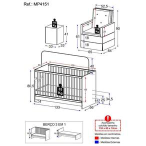 O produto será entregue desmontado e não disponibilizamos o serviço de montagem. Acabamento: Finish Foil | Tonalidade: Branco | Material: MDP | Referência do Modelo: MP4151 | Coleção: Berço | Instruções de Cuidado: Limpar com pano seco para retirar o pó. Não utilizar produtos químicos ou abrasivos a limpeza. Não aplicar lustra móveis. | Peso Suportado: 35 kg | Produto Composto Por: 1 berço, 1 colchão, 1 poltrona, 1 puff, manual de montagem e kit ferragem. | Sistema de Montagem: O produto acompanha manual de montagem juntamente com kit ferragem. O produto será entregue desmontado e não disponibilizamos o serviço de montagem. | Altura Montado: 80.5 | Largura Montado: 133 | Profundidade Montado: 66 | Tamanho (L x A x P): 133 x 80,5 x 66 | Peso do Produto: 41 | Acompanha Colchão: Sim | Vira Cama: Sim | Tamanho Colchão: 130 x 60 cm | Com gaveteiro: Não | Idade Mínima: 0 anos | Idade Máxima: 3 anos | Possui Rodízio: Não | Portátil: Não | Produto: Berço | RBN: 17352336011 | Requer Montagem: Sim | Fabricante: Multimóveis | Garantia do Fabricante: 3 | Registro INMETRO: 0000085/2018 | Altura (cm): 80,5 cm | Largura (cm): 133 cm | Profundidade (cm): 66 cm | Tipos de Madeira: N/A | Regulamentado pelo INMETRO: Sim | Altura do Produto com Embalagem: 116 | Largura do Produto com Embalagem: 74 | Comprimento do Produto com Embalagem: 135 | Peso do Produto com Embalagem: 41 | Estado de Origem: RS | Nome do Produto no Fornecedor: Kit Berço 3 em 1 com Colchão Poltrona Amamentação e Puff Multimóveis MP4151 Branco/Cinza | Produto precisa de Montagem?: Sim, sugerimos a contratação do nosso serviço de montagem (para os CEPs em que o serviço está disponível) ou de algum profissional experiente de sua preferência | Descrição do Tamanho: L x A x P: 133 x 80,5 x 66 cm | Tempo de Garantia: 3 meses | Tipo de Berço: Multifuncional | Quantidade de posições: 3 | Com muda-fraldas: Não | Com função co-sleeping: Não | Com grade removível: Não | Peso (kg): 41 kg | Destaque 1: Tamanho do berço montado (L x A x P): 133 x 80,5 x 66 cm | Destaque 2: 90 dias de garantia legal para vícios ou defeitos de fabricação. | Destaque 3: Suporta até 35kg. | Destaque 4: Acompanha colchão. | Destaque 5: Berço 3 em 1: se transforma em sofá e minicama. Cor: Branco/Bege Ean: 7909103735365
