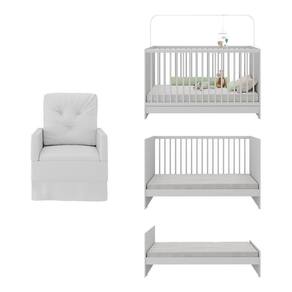 Berço 3 Em 1 Com Poltrona Amamentação Multimóveis Mp4141 Branco Branco O Berço 3 em 1 com Poltrona Amamentação Multimóveis MP4141 é perfeito para proporcionar conforto ao seu pequeno. O berço produzido em MDP com acabamento acetinado (cerca de 20% de brilho) é padrão nacional (tamanho do colchão 1,30 x 0,60), se transforma em sofá e minicama, acompanhando o crescimento do seu filho, possui 3 regulagens de altura para o colchão e acompanha suporte para mosquiteiro, garantindo noites mais tranquilas de sono para o bebê. As grades em MDF/madeira maciça de pinus garantem maior estabilidade e segurança para o bebê. Selo de certificação do INMETRO: 0000085/2018. NÃO acompanha colchão. A poltrona de amamentação (suporta até 110kg) é produzida em madeira de eucalipto e espuma densidade D23 com molas reforçadas e mecanismo de balanço. As poltronas nas cores cinza e bege possuem acabamento em tecido veludo. Poltrona na cor branca possui acabamento em material sintético. Conteúdo da Embalagem: 1 (um) Berço 1 (uma) Poltrona Kit Ferragem Manual de Montagem