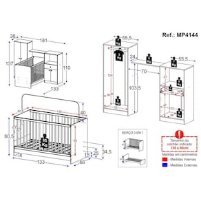 Dimensões do produto montado: Berço - Altura: 80,5cm | Largura: 133cm | Profundidade: 66cm Guarda-Roupa - Altura: 137cm | Largura: 181cm | Profundidade: 38cm *Você pode consultar as medidas detalhadas na imagem técnica do produto.