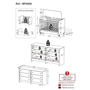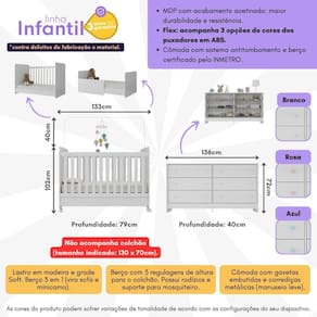 Especificações Técnicas: Dimensões do Berço - Altura: 102cm | Largura: 133cm | Profundidade: 79cm Dimensões da Cômoda - Altura: 72cm | Largura: 136cm | Profundidade: 40cm Material: MDP com grades Soft (PVC) Regulagem de altura: 3 níveis Suporte para mosquiteiro: Sim Rodízios: Sim Colchão incluso: Não, tamanho indicado: 130 x 70cm Certificação INMETRO: Selo n 005770/2018