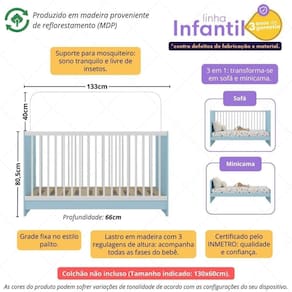 O Berço 3 em 1 para Colchão 60 x 130 cm Multimóveis MP0527G é a escolha ideal para garantir o conforto e segurança do seu bebê. Produzido em MDP com acabamento acetinado (cerca de 20% de brilho), garante durabilidade e resistência. Versátil, o berço se transforma em sofá e minicama, acompanhando o crescimento do seu filho. É padrão nacional (tamanho do colchão 1,30 x 0,60 m), possui 3 regulagens de altura para o colchão e acompanha suporte para mosquiteiro, protegendo o bebê contra insetos indesejados e garantindo noites mais tranquilas. As grades fixas são produzidas em madeira de pinus revestida. O berço é certificado pelo INMETRO sob o Selo n 000332/2025. NÃO acompanha colchão.
