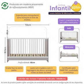 O Berço 3 em 1 para Colchão 60 x 130 cm Multimóveis MP0527G é a escolha ideal para garantir o conforto e segurança do seu bebê. Produzido em MDP com acabamento acetinado (cerca de 20% de brilho), garante durabilidade e resistência. Versátil, o berço se transforma em sofá e minicama, acompanhando o crescimento do seu filho. É padrão nacional (tamanho do colchão 1,30 x 0,60 m), possui 3 regulagens de altura para o colchão e acompanha suporte para mosquiteiro, protegendo o bebê contra insetos indesejados e garantindo noites mais tranquilas. As grades fixas são produzidas em madeira de pinus revestida. O berço é certificado pelo INMETRO sob o Selo n 000332/2025. NÃO acompanha colchão.