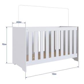 O Berço 3 em 1 com Colchão Branco Linha Aconchego Completa Móveis é feito de MDP, possui revestimento em FF e acabamento fosco, conferindo durabilidade e um visual elegante. Suas dimensões montadas são 133x79,1x64,8 cm e pesa 25,55 kg. Com um peso suportado de até 30 kg, este berço é resistente e seguro para o seu bebê.
