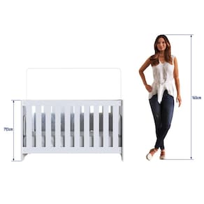 A grade do berço é fixa e feita de MDF BP, com um espaçamento entre as barras de 5,5 cm. O estrado é composto por suportes de lastros em madeira maciça e lastros em MDF, oferecendo estabilidade e conforto. Além disso, o estrado possui três opções de altura: 15 cm, 35 cm e 45 cm.
