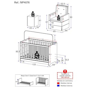 Dimensões do produto montado: Berço - Altura: 80,5cm | Largura: 133cm | Profundidade: 64cm Poltrona - Altura: 90cm | Largura: 65cm | Profundidade: 64cm Puff - Altura: 41cm | Largura: 33cm | Profundidade: 33cm *Você pode consultar as medidas detalhadas na imagem técnica do produto.