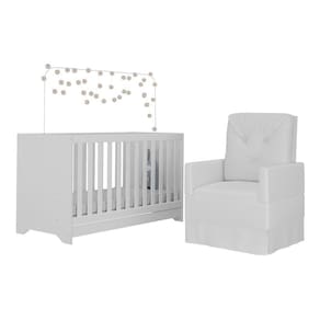 Berço 3x1 Com Poltrona De Amamentação Multimóveis Mp4070 Branco Branco O Berço 3x1 com Poltrona de Amamentação Multimóveis MP4070 foi criado para complementar o quartinho, facilitando a vida da mamãe nos preparativos para a chegada do bebê. O berço é padrão nacional (tamanho do colchão 130cm x 60cm), e se transforma em sofá e minicama, o que possibilita ser utilizado por mais tempo. Produzido em MDP com acabamento acetinado (cerca de 20% de brilho), que garante maior durabilidade e resistência, o lastro possui 3 regulagens de altura para o colchão e acompanha suporte para mosquiteiro, que garante noites mais tranquilas de sono. A grade Soft (PVC) é produzida de maneira ecologicamente correta, com matéria-prima livre de metais pesados, atóxica e com proteção antiamarelamento. Berço certificado pelo INMETRO sob o Selo n 0000085/2018. NÃO ACOMPANHA COLCHÃO. A poltrona de amamentação é produzida em madeira de eucalipto, com revestimento em material sintético, molas reforçadas e mecanismo de balanço, proporcionando muito aconchego. Capaz de suportar 110kg, o assento possui densidade D23, que garante maior conforto e durabilidade. Conteúdo da Embalagem: 1 (um) Berço 1 (uma) Poltrona Kit Ferragem Manual de Montagem