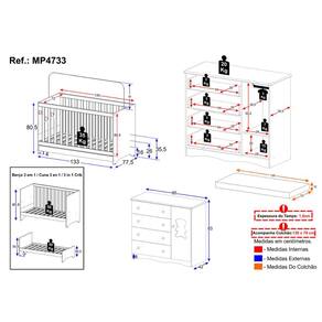 Dimensões do Produto Montado: Berço - Altura: 80,5cm | Largura: 133cm | Profundidade: 77,5cm Colchão - Altura: 10cm | Largura: 130cm | Profundidade: 70cm Cômoda - Altura: 83cm | Largura: 95cm | Profundidade: 42cm *Você pode consultar as medidas detalhadas na imagem técnica do produto.