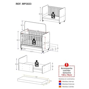 Dimensões do produto montado: Berço - Altura: 98,5cm | Largura: 132,5cm | Profundidade: 79cm Colchão - Altura: 10cm | Largura: 130cm | Profundidade: 70cm *Você pode consultar as medidas detalhadas na imagem técnica do produto.