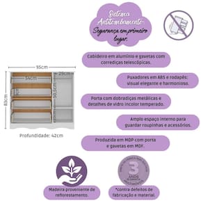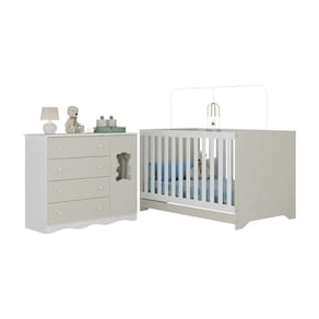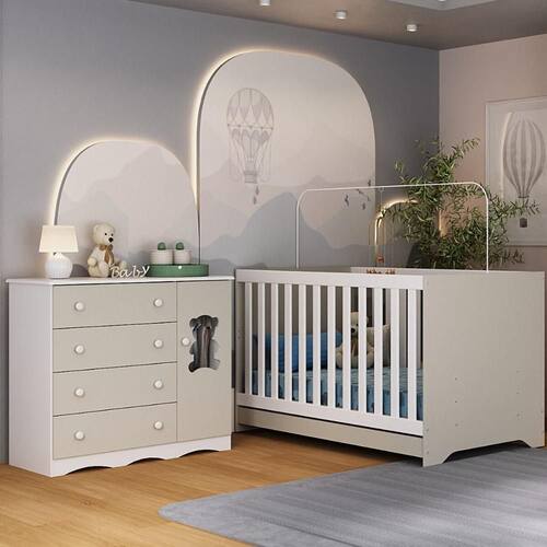 Diferenciais: - 3 anos de garantia contra defeitos de fabricação e material. - Conjunto produzido em madeira de reflorestamento (MDP 12/15mm) com acabamento acetinado (cerca de 20% de brilho): sustentabilidade e durabilidade. - Berço 3 em 1 que se transforma em sofá e minicama, acompanhando o crescimento do bebê. Grade Soft (PVC): ecologicamente correta, com matéria-prima livre de metais pesados, atóxica e com proteção antiamarelamento. - Lastro em madeira com 3 regulagens de altura e suporte para mosquiteiro para noites mais tranquilas e protegidas. - Berço certificado pelo INMETRO (Selo n 000085/2018). - Padrão americano (tamanho do colchão indicado: 130x70cm). Colchão não incluso. - Cômoda com 1 porta, 4 gavetas (frontais em MDF) e rodapé usinado: amplo espaço interno e elegância. - Sistema antitombamento na cômoda: proporciona segurança para o bebê e tranquilidade aos pais. - Porta com detalhe de vidro incolor temperado (3mm): toque charmoso que permite visualizar o interior do móvel. - Corrediças telescópicas: abertura total e silenciosa das gavetas. - Cabideiro de alumínio: permite acomodar as roupinhas para que não amassem. - Puxadores em ABS delicados e práticos.
