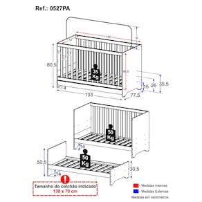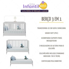 Diferenciais: - Produzido em madeira de reflorestamento (MDP 12/15mm): garante durabilidade e resistência. - Acabamento acetinado (cerca de 20% de brilho): facilidade na limpeza do móvel. - Transforma-se em sofá e minicama: acompanha o crescimento da criança. - Padrão americano (tamanho do colchão indicado: 130x70cm). Colchão não incluso. - Acompanha suporte para mosquiteiro: noites de sono mais tranquilas para o bebê. - Lastro de madeira com 3 regulagens de altura para o colchão. - Grade Soft (PVC): ecologicamente correta, com matéria-prima livre de metais pesados, atóxica e com proteção antiamarelamento. - Suporta até 35kg (50kg como sofá ou minicama). - Certificado pelo INMETRO sob o Selo n 0000085/2018: confiável e seguro.