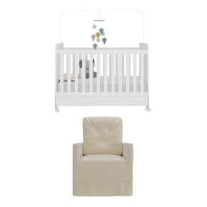 Berço Americano 3x1 Com Colchão Incluso Poltrona De Amamentação Multimóveis Mp4089 Branco/bege Branco/bege O Berço Americano 3x1 com Colchão Incluso Poltrona de Amamentação Multimóveis MP4089 foi criado para complementar o quartinho, facilitando a vida da mamãe nos preparativos para a chegada do bebê. O berço é padrão americano (tamanho do colchão 130cm x 70cm) e se transforma em sofá e minicama, o que possibilita ser utilizado por mais tempo. Produzido em MDP com acabamento em pintura UV e Laca PU, que garante maior durabilidade e resistência. O lastro do colchão possui 3 regulagens de altura e acompanha suporte para mosquiteiro, que garante noites mais tranquilas de sono. A grade Soft (PVC) é produzida de maneira ecologicamente correta, com matéria-prima livre de metais pesados, atóxica e com proteção antiamarelamento. Berço certificado pelo INMETRO sob o Selo n 005770/2018. O Colchão D18 (suporta 50kg), que acompanha o berço, é produzido 100% em tecido poliéster com preenchimento em espuma. Possui tratamento anti-ácaro e anti-alérgico e é indicado para crianças de até 3 anos. A poltrona de amamentação é produzida em madeira de eucalipto, com revestimento em tecido veludo, molas reforçadas e mecanismo de balanço, proporcionando muito aconchego. Capaz de suportar 110kg, o assento possui densidade D23, que garante maior conforto e durabilidade. Conteúdo da Embalagem: 1 (um) Berço 1 (um) Colchão 1 (uma) Poltrona Kit Ferragem Manual de Montagem