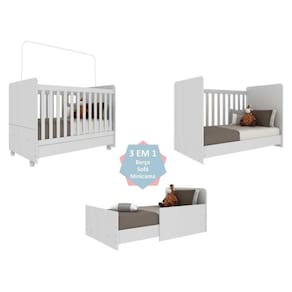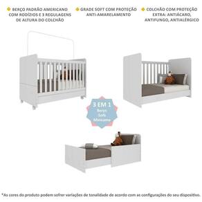 O Berço Americano 3x1 com Colchão Incluso e Rodízios Pimpolho Multimóveis é a escolha perfeita para garantir o conforto e segurança do seu bebê. Produzido em MDP/MDF que garante maior durabilidade e resistência, este berço padrão americano (tamanho do colchão 130 x 70cm)certificado pelo INMETRO acompanha colchão densidade D18, macio com tratamento anti-ácaro e anti-alérgico, proporcionando um sono tranquilo e saudável para o seu pequeno. A grade Soft (PVC) é produzida de maneira ecologicamente correta, com matéria-prima livre de metais pesados, atóxica e com proteção anti-amarelamento. Como sabemos que os espaços precisam ser otimizados nos dias atuais, ele se transforma emsofá e minicama, acompanhandocrescimento da criança. O lastro possui 3 regulagens de altura para o colchão e o suporte para mosquiteiro protege seu bebê dos insetos indesejados durante a noite. Com acabamento acetinado (cerca de 20% de brilho) e design moderno, os rodízios facilitam na hora da limpeza ou mudança do móvel dentro do quarto. Certificado pelo INMETRO sob o Selo n 005770/2018.