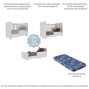 o berço americano 3x1 com colchão incluso e rodízios pimpolho multimóveis é produzido em mdp/mdf, que garante maior durabilidade, facilidade na limpeza e possui acabamento acetinado (cerca de 20% de brilho). o berço 3 em 1 (se transforma em sofá e minicama), é padrão americano (tamanho do colchão 1,30 x 0,70), com rodízios (2 com trava de segurança) que facilitam a movimentação na hora da limpeza, possui 3 regulagens de altura para o colchão e acompanha suporte para mosquiteiro, que garante noites mais tranquilas de sono para o bebê. a grade soft (pvc) é produzida de maneira ecologicamente correta, com matéria-prima livre de metais pesados, atóxica e com proteção antiamarelamento. o colchão, densidade d18, que acompanha o berço, possui tratamento antiácaro, antialérgico e antimofo e é indicado para crianças de até 3 anos. berço certificado pelo inmetro sob o selo n 005911/2017.