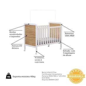 O Berço Americano Cloe 2 em 1 oferece segurança, versatilidade e charme para o quarto do bebê. Com estrutura em MDF e pintura UV atóxica, é certificado pelo INMETRO e possui padrão americano. Funcional, pode ser utilizado como berço ou mini cama, acompanhando o crescimento da criança. Conta com 3 regulagens de altura do estrado, grades fixas, bordas arredondadas e laqueadas, além de 4 rodízios, sendo 2 com trava para maior praticidade. Suporta até 40kg, acompanha suporte para mosquiteiro e para completar o Colchão Baby Physical da Ortobom vai proporcionar noites mais tranquilas a aconchegantes.