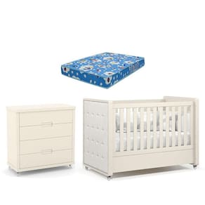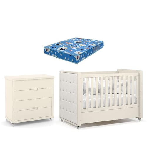 Berço Americano com Capitonê New Boucle e Cômoda Gaveteiro Infantil Tutto New Off White e Colchão Ortobom - Matic