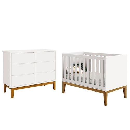 MDFBerço Americano com Cômoda 6 Gavetas New Classic Branco com Pés Madeiras Reller