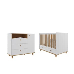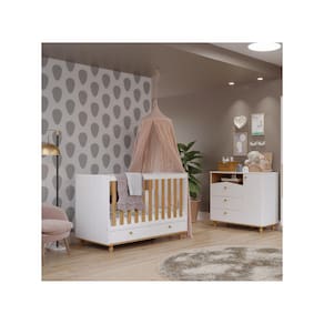 Seguindo linhas mais retas, esse berço combina com qualquer estilo decorativo. As cabeceiras possuem baixo relevos com acabamento em laca, um detalhe que faz toda a diferença. Possui 2 gavetões com corrediças telescópicas com bastante espaço interno para organização de roupas de cama, brinquedos, roupinhas, fraldas e etc. Os puxadores e pés são torneados em madeira maciça e conferem um charme especial ao produto. A base do produto é inteiriça, o que proporciona maior resistência e estabilidade.Fabricado com matéria-prima 100% MDF, um material ecologicamente correto e de ótima durabilidade e resistência. É um produto sinônimo de SEGURANÇA, pois é fabricado conforme as normas exigidas pela ABNT e certificado pelo INMETRO (Certificaçao Compulsória de segurança INMETRO). O estrado é fabricado com barrotes de madeira e base de MDF 6mm.As ferragens para sua fixação ficam ocultas e assim a cabeceira não fica cheia de furos e parafusos aparentes. Possui 2 regulagens de altura (uma mais alta para quando o bebê ainda é bem novinho e outra mais baixa para quando o bebê já se movimenta e consegue ficar sentado).Atenção para a altura do colchão que não pode passar de 12cm. As bordas são todas arredondadas e recebem pintura em lacca com tinta atóxica e as peças retas recebem pintura UV também com tinta e verniz atóxicos. Esse berço não possui suporte para cortinado incluso. Recomendamos que seja utilizado suporte de parede ou de teto.Berço desenvolvido para uso de colchão padrão americano de 0,70x1,30m. Atenção para a altura do colchão que não pode passar de 12cm. Registro inmetro BRE-6372018-4 Medidas do móvel montado ALT 97cm X COMP 134cm X PROF 78cm; 01 cômoda casinha com portaSeguindo o estilo lúdico, essa cômoda é perfeita para quem precisa de bastante espaço para organizar o enxoval dos pequenos.Possui nicho superior para organizar objetos de uso diário e 03 gavetas grandes com corrediças telescópicas que proporcionam deslizamento suave, maior abertura e melhor acesso às roupas.Possui também 01 porta de abrir com prateleira interna e 01 cabideiro para você montar de acordo com sua necessidade.Os puxadores e pés são torneados em madeira maciça e conferem um charme especial ao produto.O tampo possui bordas arredondadas que recebem pintura em laca com tinta atóxica e as peças retas recebem pintura UV também com tinta e verniz atóxicos.Fabricada com matéria-prima 100% MDF, um material ecologicamente correto e de ótima durabilidade e resistência. Medidas do móvel montado ALT 95cm X LARG 112cm X PROF 47cm;Atenção: Por favor, confira as dimensões do produto e certifique-se de que estão adequadas aos elevadores, portas e corredores do local de entrega, pois não fazemos a montagem, desmontagem do produto e/ou portas e janelas, transporte pela escada ou içamento pelo lado de fora do prédio.