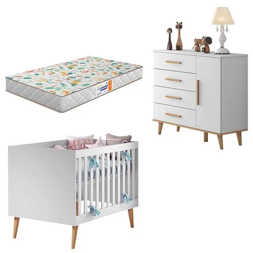 Berço Americano e Cômoda Infantil Ludmila Branco Bétula com Colchão Gazin – Carolina