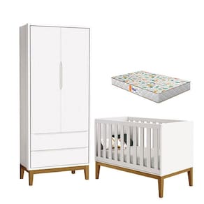 Berço Americano e Guarda Roupa 2 Portas New Classic Branco com Pés Madeira e Colchão Gazin – Reller