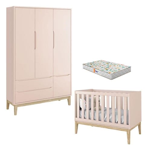 Berço Americano e Guarda Roupa 3 Portas New Classic Rosa com Pés Madeira Natural e Colchão Gazin – Reller