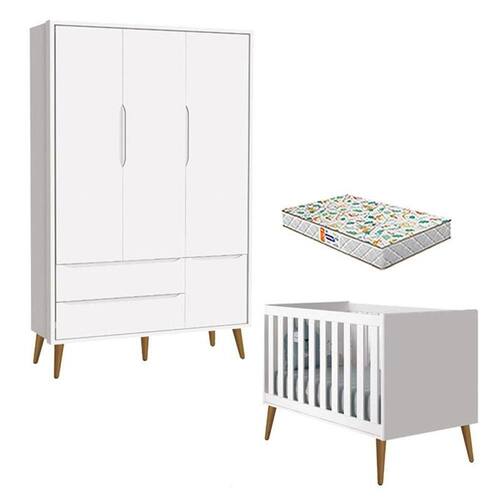 Berço Americano e Guarda Roupa 3 Portas Theo Branco Pés Amadeirados com Colchão Gazin Reller